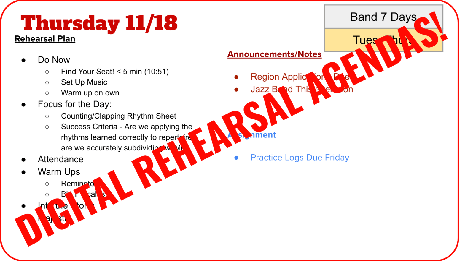 For anyone who has ever sat in a band rehearsal, you have probably gone through the routine of setting up and checking the board for the rehearsal order. Or maybe it’s been slightly updated and you’re checking your email beforehand at your community band rehearsal like I do. For those school band directors who areContinue reading “Digital Rehearsal Agenda”